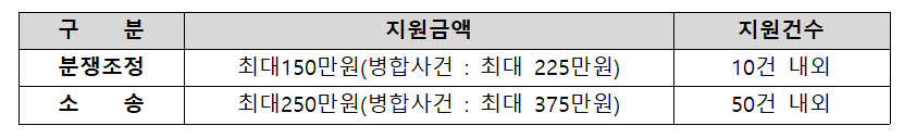 소상공인의 불공정거래 피해 분쟁 발생 시 신고 조정, 소송등의 지원을 통해 신속히 해결 및 피해 최소화를 위하여 분쟁조정 또는 소송 대리인 선임 비용 지원합니다.
