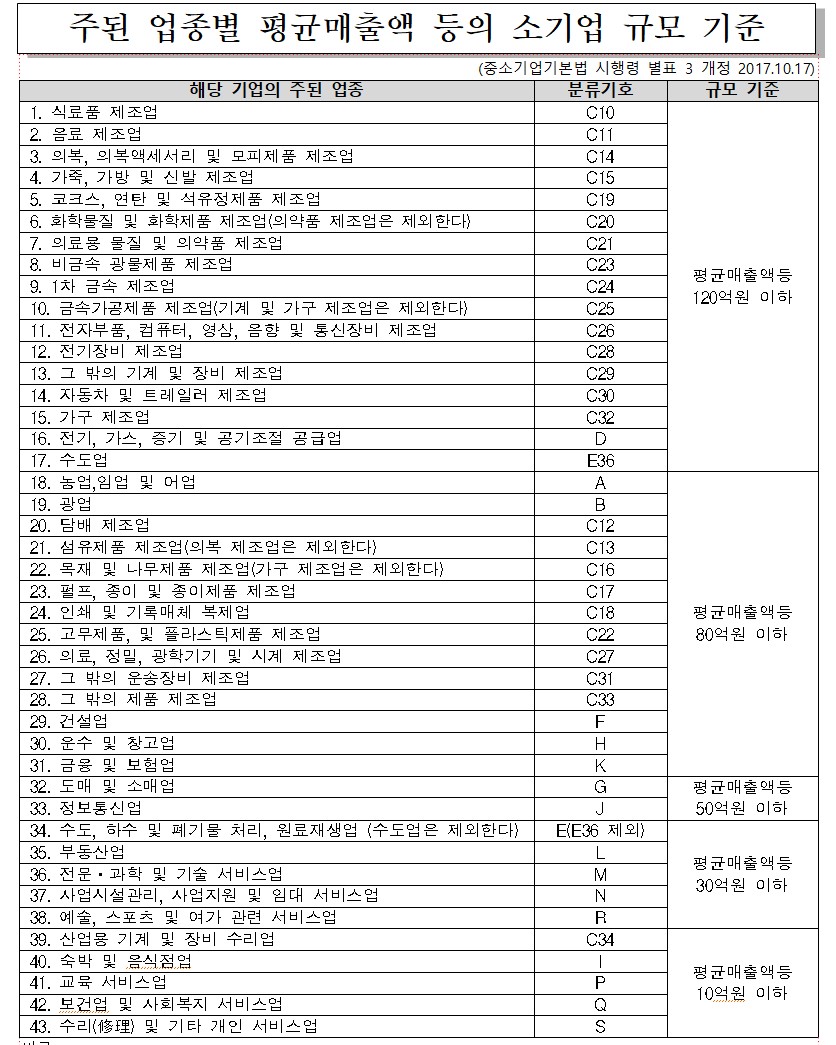 - 주된 업종별 평균매출액등의 소기업 규모 기준 이하인 업체